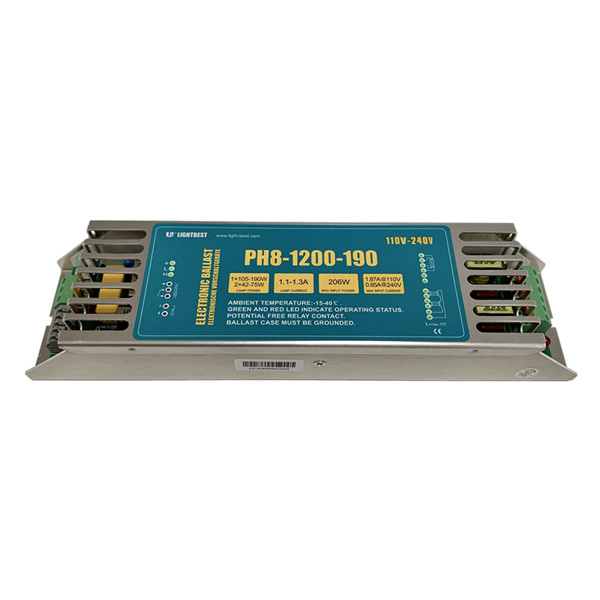 | PH8-1200-190 | 1,87A à 110V 0,85A à 240V | 206 | 250*65*40 | 1,0-1,2 | 42-190 | 1 * lampe: GPHA1000T5 GPHA1554T5 2 * lampe: GPHA843T5 GPHA357T5 |